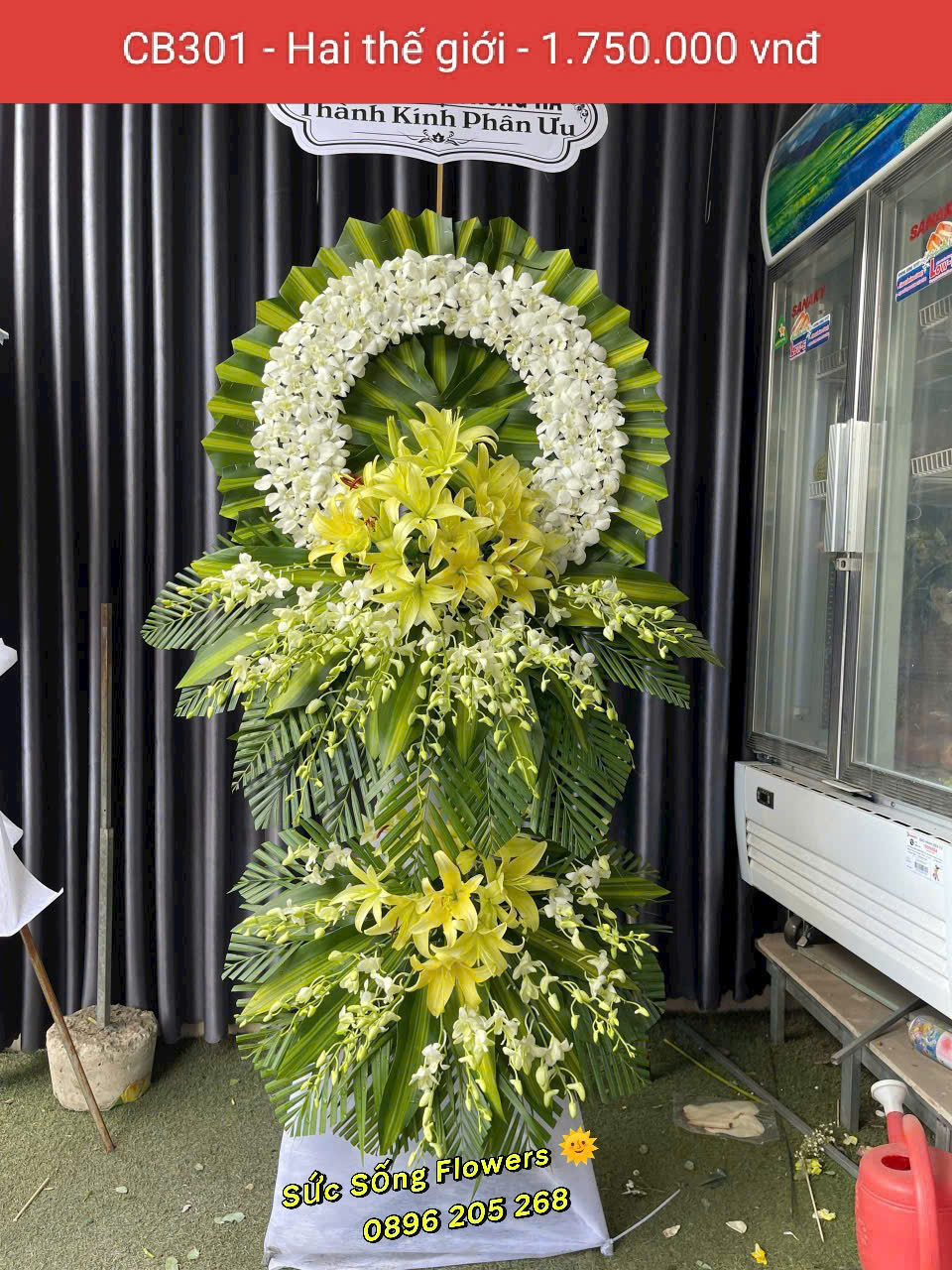 Kệ hoa chia buồn “CB301 – Hai thế giới” sẽ thay bạn tiễn đưa người đã khuất về với miền cực lạc. Hãy yên nghĩ bạn nhé