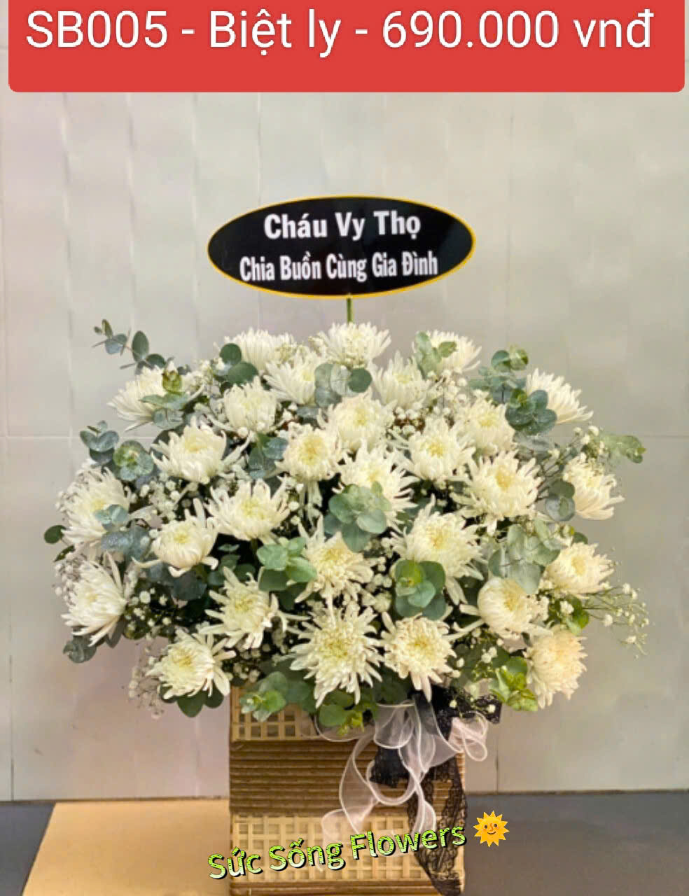 Hộp hoa chia buồn “SB005 – Biệt ly” sẽ thay bạn gởi gắm tình cảm đến người đã mất và chia sẻ nỗi đau cùng gia quyến