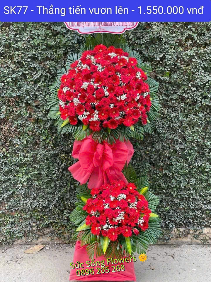 Kệ hoa chúc mừng “SK77 – Thẳng tiến vươn lên” được các florist đầu tư một cách nghiêm túc phục vụ các dịp khai trương, khánh thành, tổ chức sự kiện và trong các dịp lễ quan trọng khác.